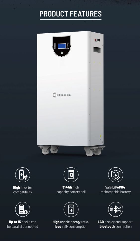 The CHISAGE 51.2V 320Ah battery is built with high-quality EVE LiFePO4 cells and an intelligent CN BMS system, ensuring maximum safety, reliability, and long service life. Suitable for wall or floor installation in solar systems, UPS, and off-grid applications.